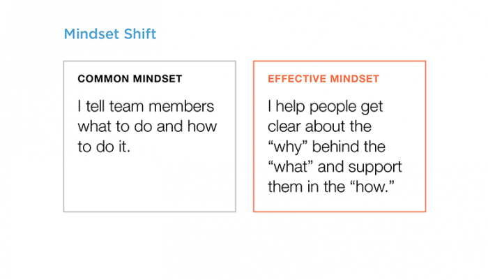 To be an effective leader, individuals must shift from thinking ‘I tell team members what to do and how to do it’ to ‘I help team members get clear about the “why” behind the “what” and support them in the “how.”’